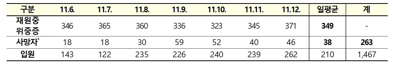 □ 중앙방역대책본부(본부장: 백경란)는 11월 2주간 일평균 재원중 위중증 환자수는 349명, 일평균 사망자는 38명으로 누적 사망자는 29,617명이라고 밝혔다.