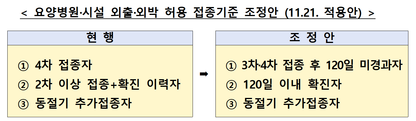 ○ 또한 11월 21일부터는 요양병원과 시설의 외출·외박 기준을 변경, 추가접종자(3차·4차) 또는 확진자의 경우에도, 접종 또는 확인일로부터 120일이 경과한 후에는 2가백신을 접종해야 외출·외박이 가능하도록 조정한다.