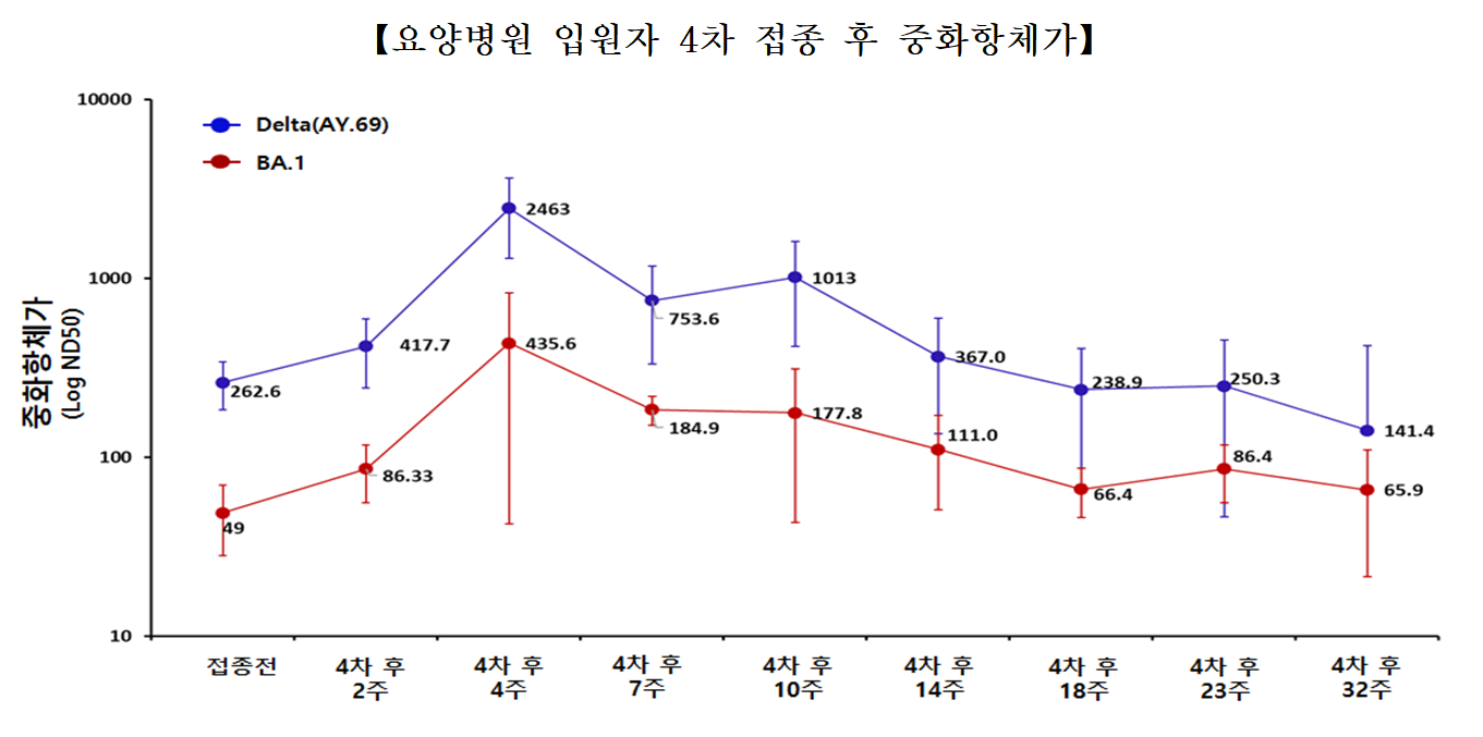 ○ 고위험군인 요양병원 입원자(58-94세)를 대상으로 4차 접종 후 32주까지 델타** 및 오미크론 변이주에 대한 중화항체가*를 분석한 결과, 4차 접종 후 4주까지 중화항체가가 증가하였으나, 7주부터 32주까지 지속적으로 감소하였다.
