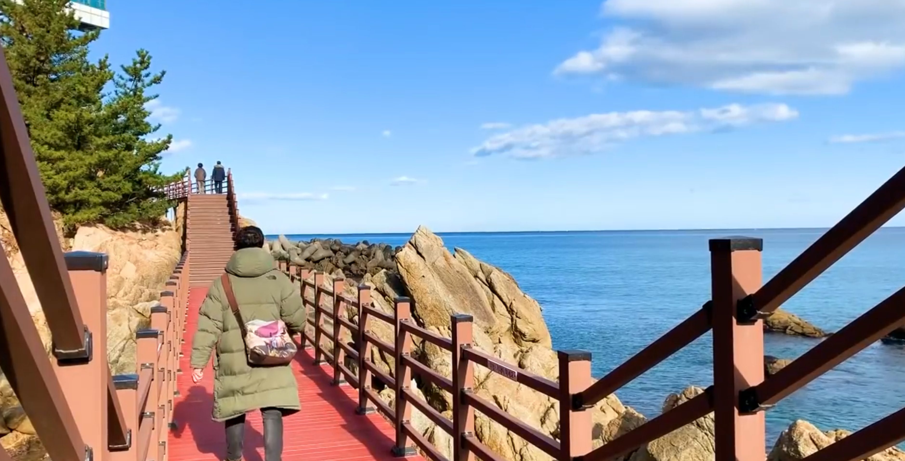 그리고 두 번째, 하조대 해수욕장에는 스카이워크 전망대가 있어서 시원하게 탁 트인 동해 바다를 한눈에 볼 수가 있습니다. 멋진 일몰도 감상할 수 있는 곳이에요. 이 전망대가 진짜 매력 포인트입니다. 올라가 봤더니 동해의 깨끗한 물이 위에서 보니까 확실히 더 잘 보여요 그리고 이 굽이굽이 밑에 펼쳐져 있는 길들이 아름다움을 더 느낄 수 있게 하거든요. 전망대 옆길이 정말로 좋습니다! 완전 고요하고 또 신기하고 이 눈길은 꼭 걸어보시면 좋을 것 같아요. 오히려 해수욕장보다 전망대에 사람이 더 많을 정도니까 만약에 하조대 가신다면 전망대 절대 잊어버리지 말고 꼭 가보셔야 합니다.