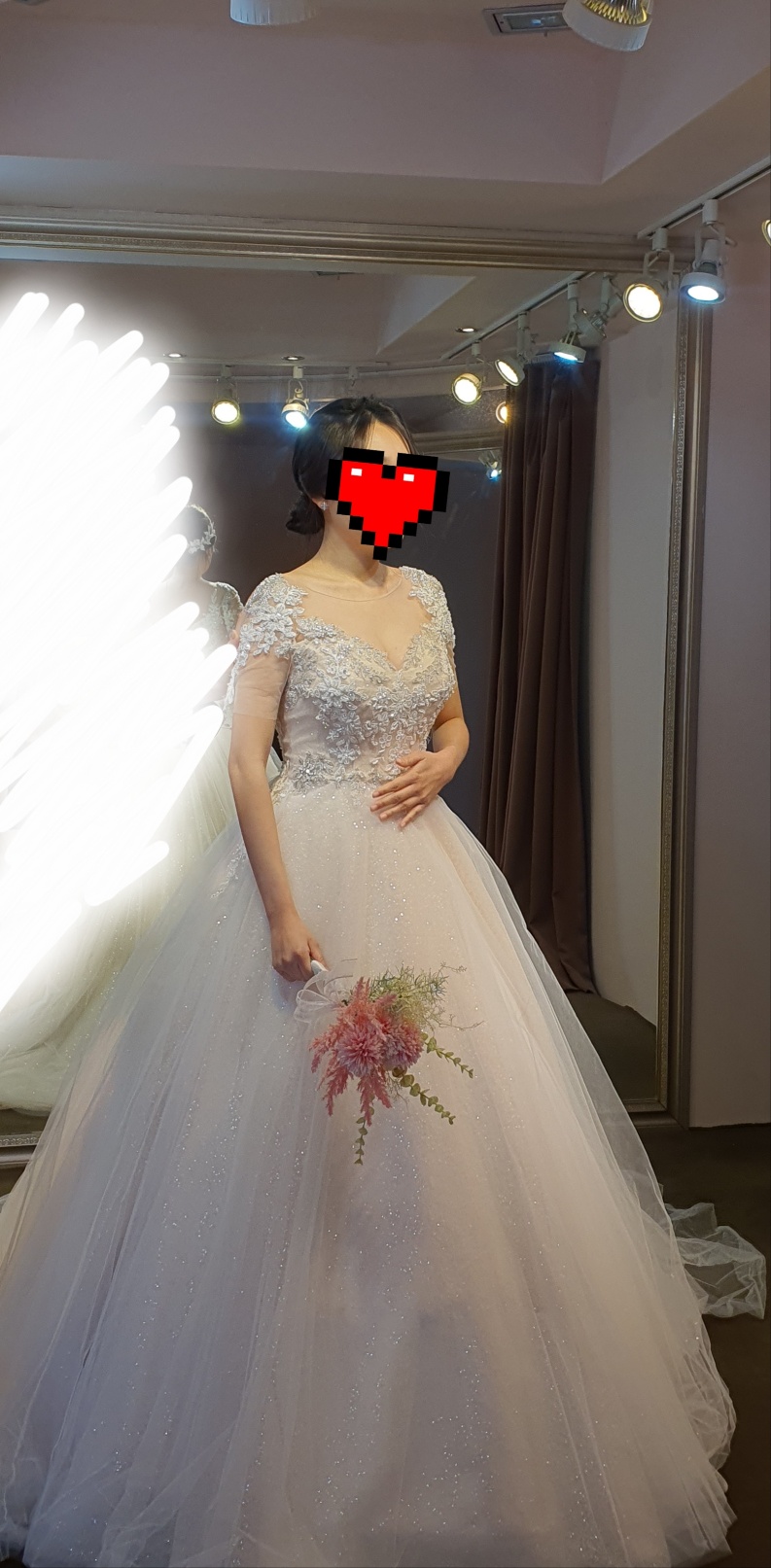 이 외에도 반짝이는 보석들 많이 달린 드레스랑 레이스 달린 드레스, 과감한 디자인의 드레스도 여러 벌 입어보았는데요.
