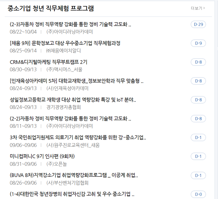 홈페이지에 들어가면 화면 중반부에 중소기업 청년 직무체험 프로그램 목록이 날짜 마감일에 따라 정렬되어 있습니다. 여기서 더보기를 누르면, 다양한 프로그램들을 상세하게 볼 수 있습니다. 따라서 각 직무체험을 훑으며 자신이 원하는 항목에 들어가면 탐방기업과 프로그램 정보를 상세히 알 수 있습니다.