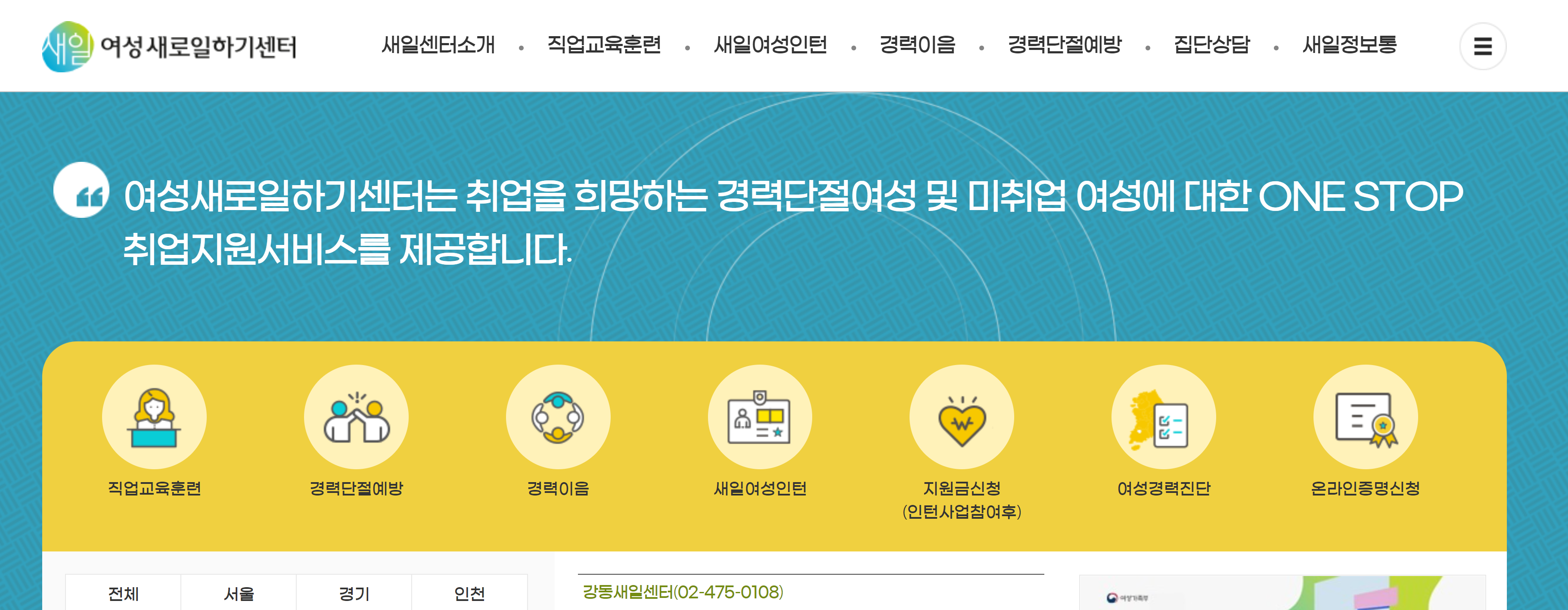 대표적으로 여성새로일하기센터가 있었는데 취업 지원, 상담, 직업교육훈련, 새일여성인턴 등이 있었습니다. 다만 현재 거주하는 주소지와는 거리가 다소 있었던 지라 가까운 곳에 위치한 고용센터를 방문했습니다. 고용센터에도 실업자, 경력단절여성 등을 위한 취업 지원을 하고 있었기 때문입니다.