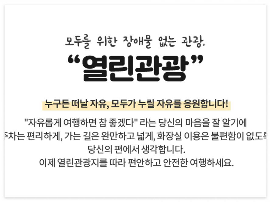 본 저작물은 '정책브리핑'에서 '22년'작성하여 공공누리 제1유형으로 개방한 '휠체어도 문제 없는 열린관광지! (최병용 작성) '을 변형 이용하였으며, 해당 저작물은 '정책브리핑 www.korea.kr'에서 무료로 다운받으실 수 있습니다.