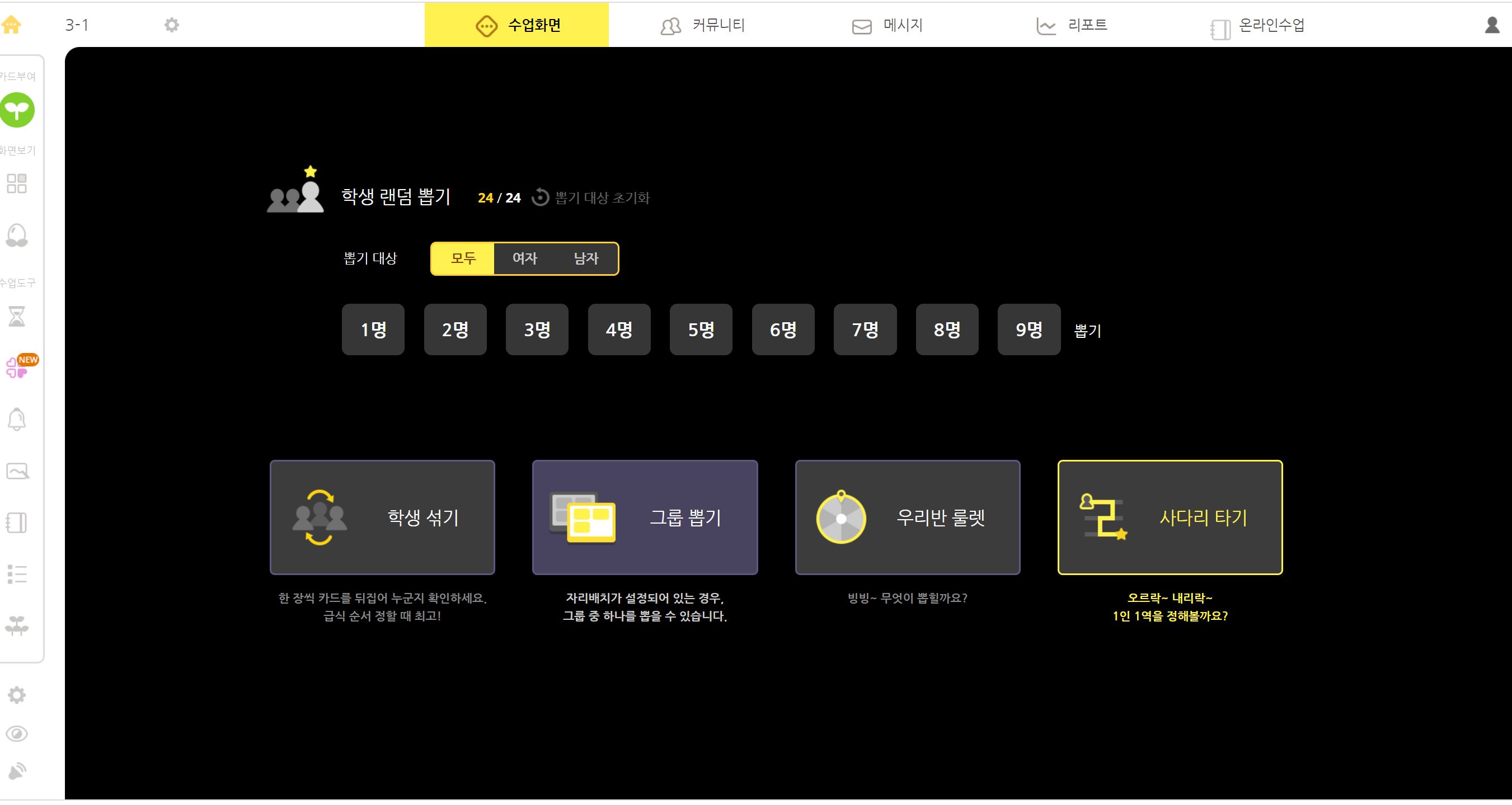 - 학생섞기, 사다리 타기 등을 활용해 재밌게 랜덤뽑기 가능 (예를 들어, 학생섞기는 카드 뒤집으면 학생이름이 보임)