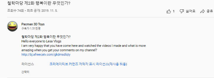 그중 한 영상을 클릭해봤어요. 영상 설명란에 라이선스가 있고 "크리에티브 커먼즈 저작자 표시 라이선스(재사용 허용)"이라고 적혀 있는 것이 보이네요! 실제로 CC BY 라이선스인지 꼭 해당 영상에 들어가서 확인하셔야 합니다. 여기서 과연 이 라이선스는 6가지 종류 중 어떤 종류의 라이선스인가 하는 의문이 생겼는데.. 다른 블로그나 웹사이트도 그렇고 유튜브 설명도 보니 저작권 표시만 하면 가공도 가능하고 상업적 이용도 가능한 CC-BY 영상이더라고요! 저작권 제한 없는 영상 사이트가 유튜브였다니! 드디어 찾았네요!