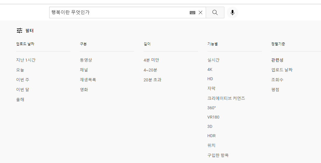 자 이제는 무료 저작권 영상을 찾아봐야겠죠? 바로..! 유튜브에서 가능하답니다. 모두들 유튜브를 들어가서 아무 관심 주제를 검색해보세요. 저의 경우는 "행복이란 무엇인가"를 검색해봤습니다. 그리고 필터를 누르시면 [기능별]에 [크리에이티브 커먼즈]가 있을 거예요!